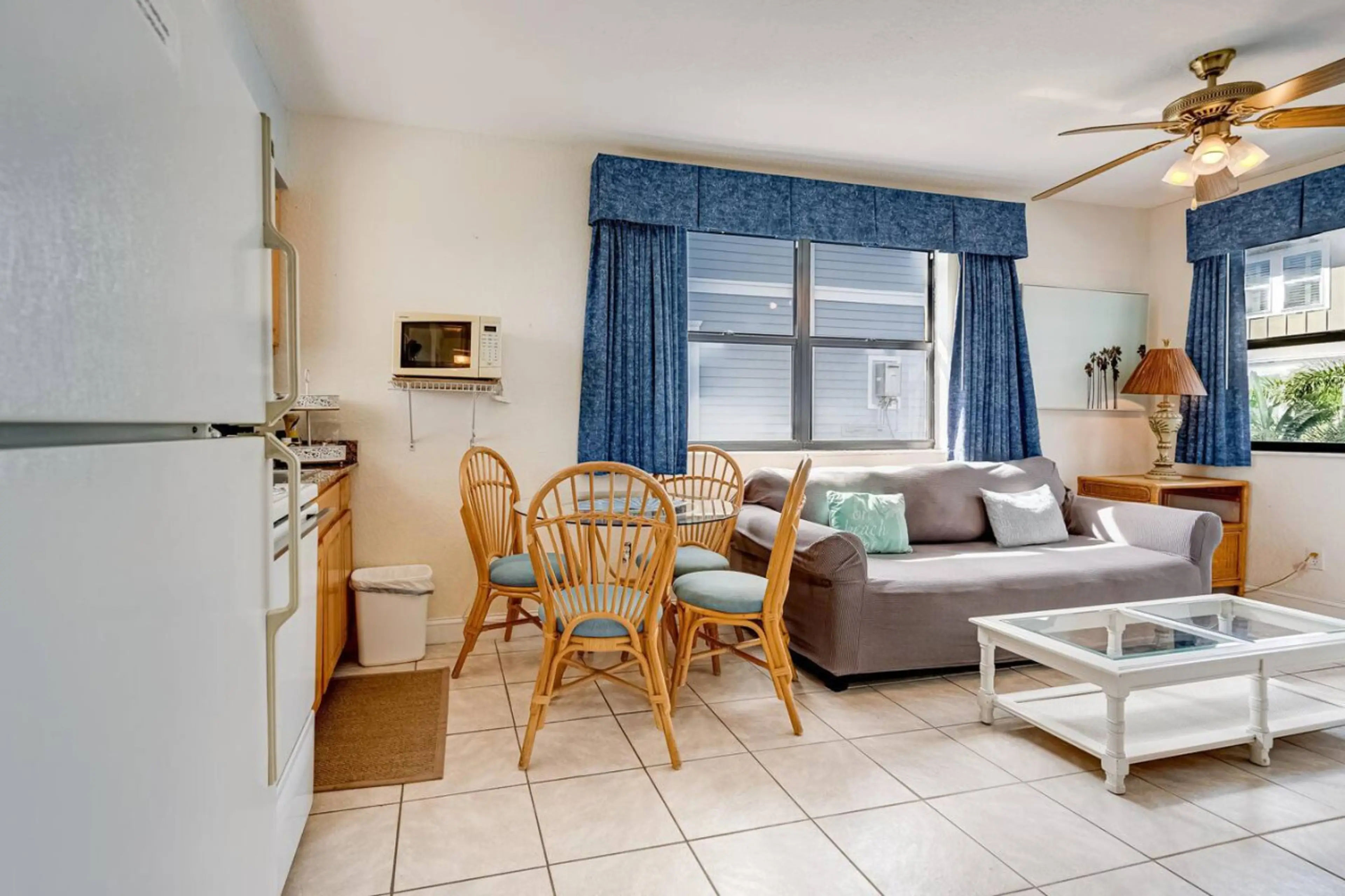 Negative: The furniture in the living room was very uncomfortable. The couch was really old, it was covered with a couch cover that kept coming off. The arms had no cushion left in them, and you would slide off it when sitting down, somehow it was slanted forward. The dining set took up too much room. We spent most the time in the bedroom since there really wasn't anywhere to sit in the living room.